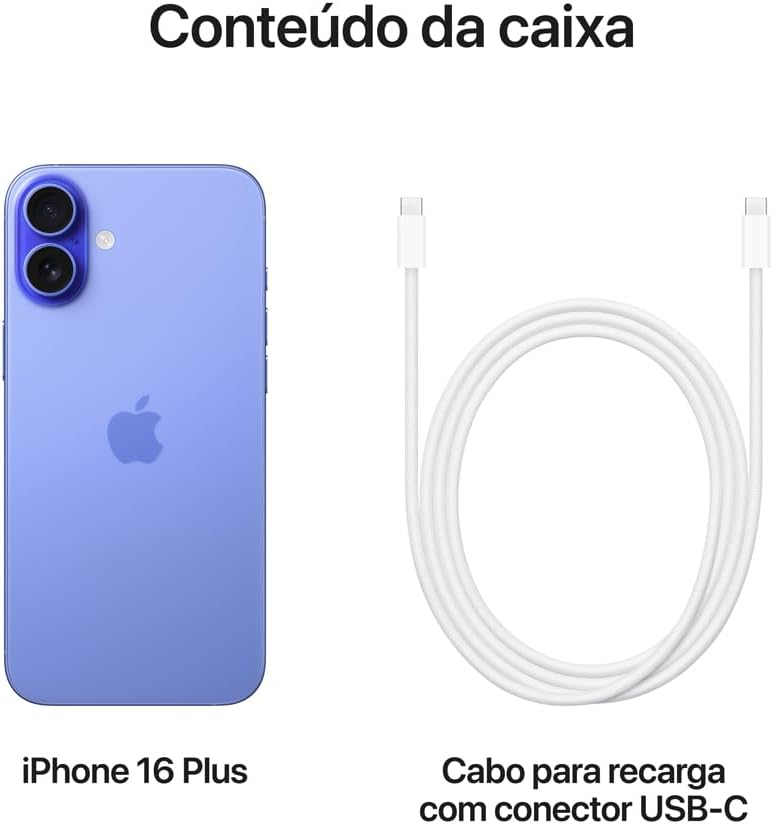Conteúdo da caixaiPhone com iOS 18 Cabo para recarga com conector USB-C (1m) Documentação