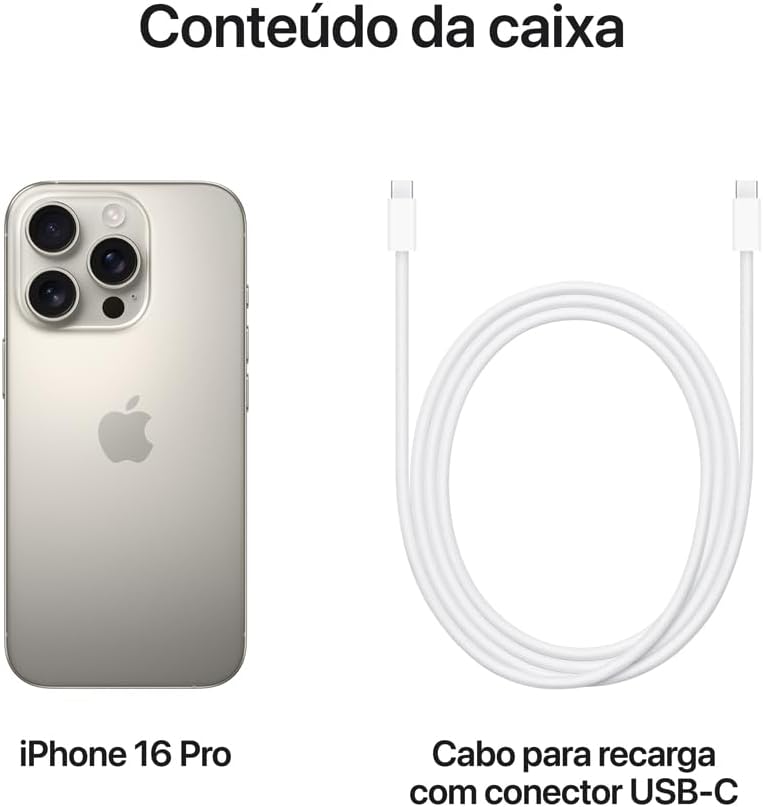 | Conteúdo da caixa | iPhone com iOS 18 Cabo para recarga com conector USB-C (1m) Documentação |
